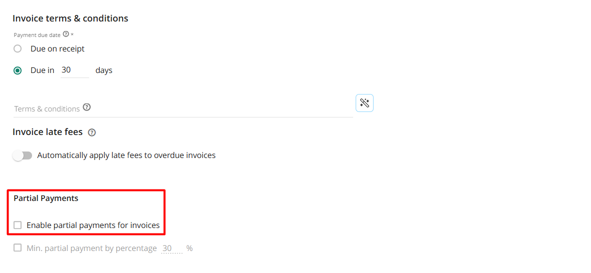 - Check Enable partial payments for invoices under the “Partial Payments” section.